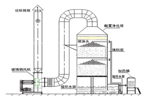 通風(fēng)中需處理的廢氣,由玻璃鋼離心風(fēng)機(jī)壓入噴淋塔之進(jìn)氣短后,垂直向上與噴淋段自上而下的吸收液起中和反應(yīng),使廢氣濃度降低,然后繼續(xù)向上進(jìn)入填料段,廢氣在塑料球打滾再與吸收液起中和反應(yīng),使廢氣濃度進(jìn)一步降低后進(jìn)入脫水器段,脫水液滴,凈化后達(dá)到排放標(biāo)準(zhǔn)。